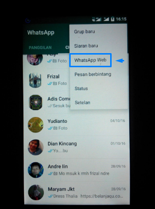 2. Buka aplikasi Whatsapp di handphone Anda dipojok kanan atas klik - Menu – dan klik Whatsapp Web